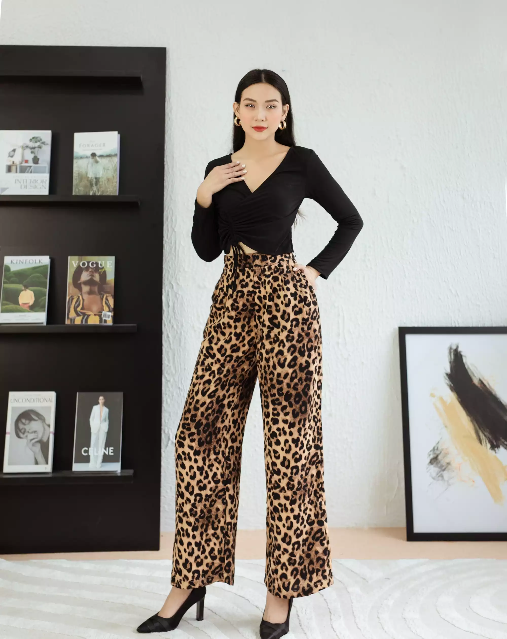 Kiểu dáng của quần được thiết kế với kiểu quần dài ống rộng, tạo cảm giác thoải mái và phong cách. Lưng cao giúp che khuyết điểm và tôn lên vòng eo, tạo vẻ thon gọn cho người mặc. Quần cũng có túi hông, mang tính thực tiễn và tiện dụng.